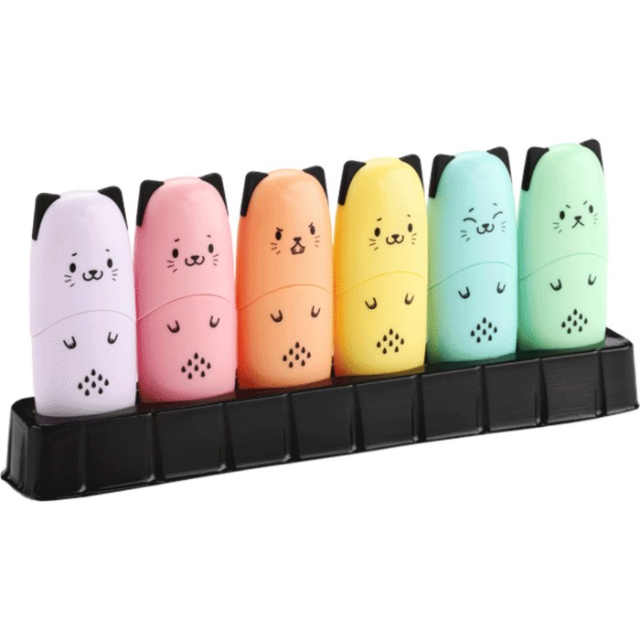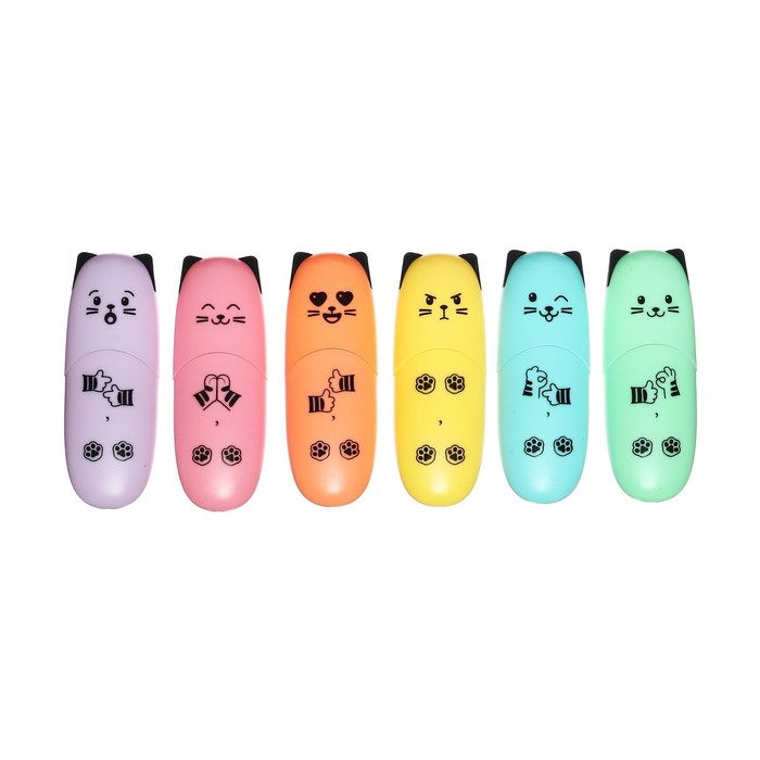 Набор маркеров-выделителей deVENTE. Kitty (6 цветов - пастельные цвета: роз, желт, зелен, фиол, оранж, гол) плоский мини-корпус, скошенный наконечник, ширина линии 1-5 мм, на специальном поддоне в пластиковой упаковке.
