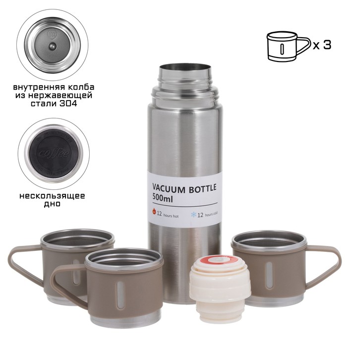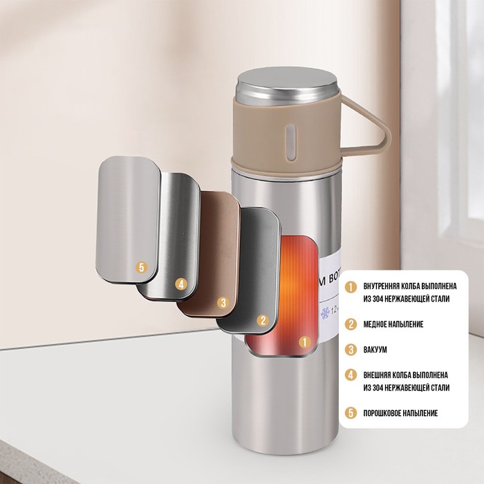Изготовлен из высококачественной нержавеющей стали с двойными стенками, что обеспечивает длительное сохранение тепла вашего кофе или чая до 12 часов, а его противоударный корпус, оформленный в форме стандартной бутылки, делает его прочным и стильным. Колба термоса не только обеспечивает долгий срок службы, но и гарантирует безопасность, особенно при перевозке или использовании на открытом воздухе.