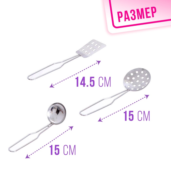 Набор металлической посуды — альтернатива взрослой кухонной утвари. В процессе игры малышка сможет абсолютно безопасно пользоваться принадлежностями для готовки: они лёгкие, простые в использовании, их размеры рассчитаны на ребёнка. Дочурка с удовольствием будет баловать свои игрушки кулинарными шедеврами, перенимая мамины рецепты.