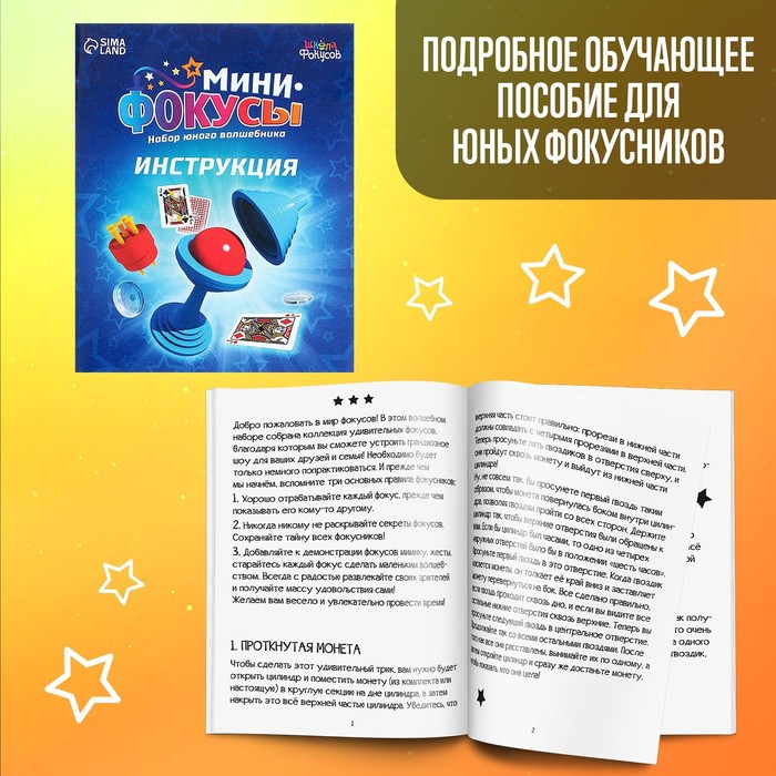Повторяйте фокусы из инструкции, придумывайте свои и воплощайте их с помощью реквизитов из набора.