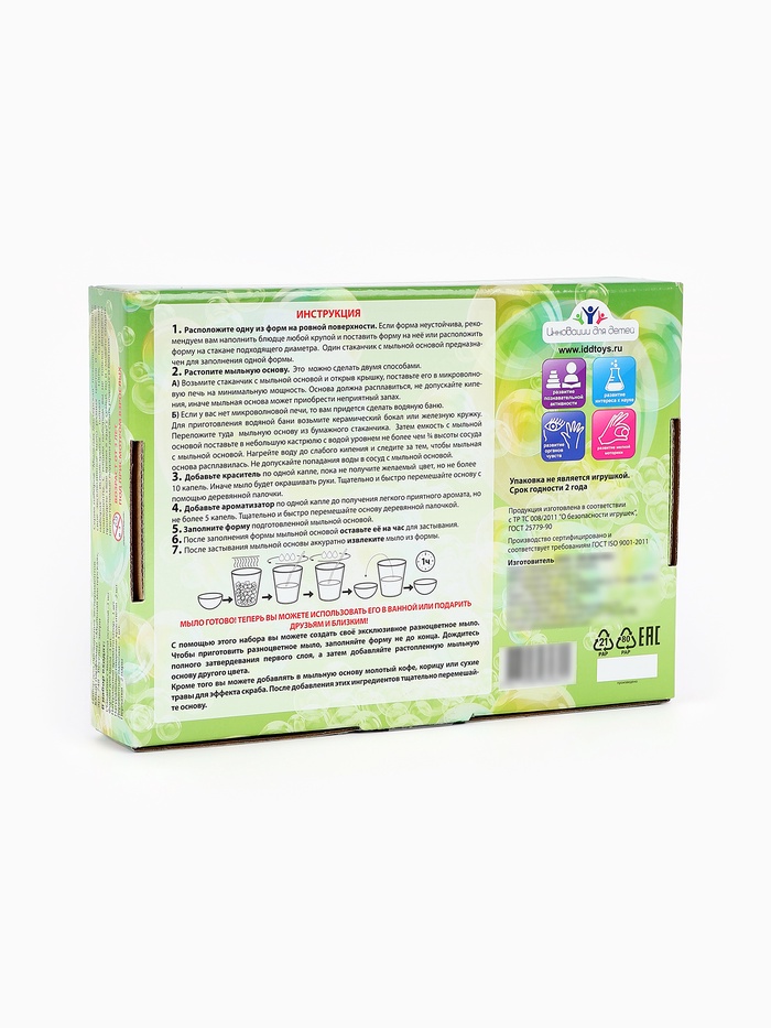 Этот творческий набор идеально подходит для детского досуга, развития фантазии и знакомства с основами мыловарения.