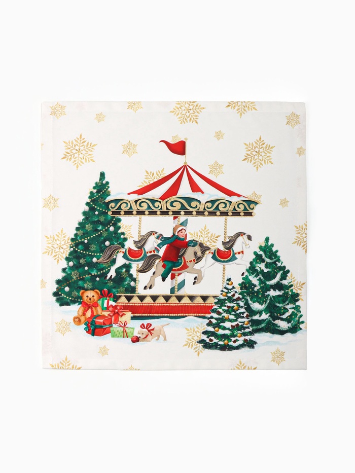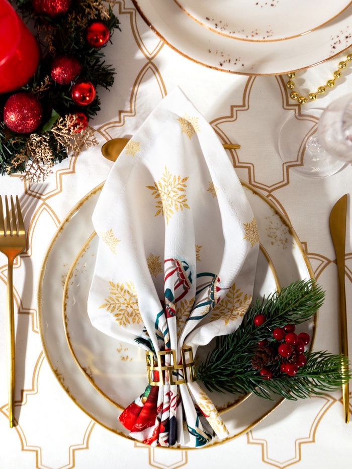 - Тематический дизайн: Сочетание белого фона с золотистыми элементами создаёт атмосферу зимней ярмарки — салфетки становятся органичной частью праздничного декора.