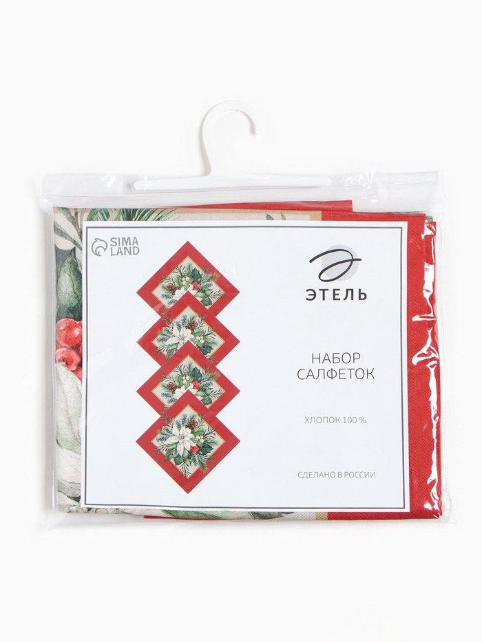 Красные салфетки с рождественским венком для создания праздничной атмосферы за столом! Набор из четырёх текстильных аксессуаров с цветочно-растительным мотивом поможет оформить пространство для зимнего торжества. Плотная хлопковая основа с саржевым переплетением обеспечивает защиту поверхности и сохраняет интенсивность цвета после многократного использования.