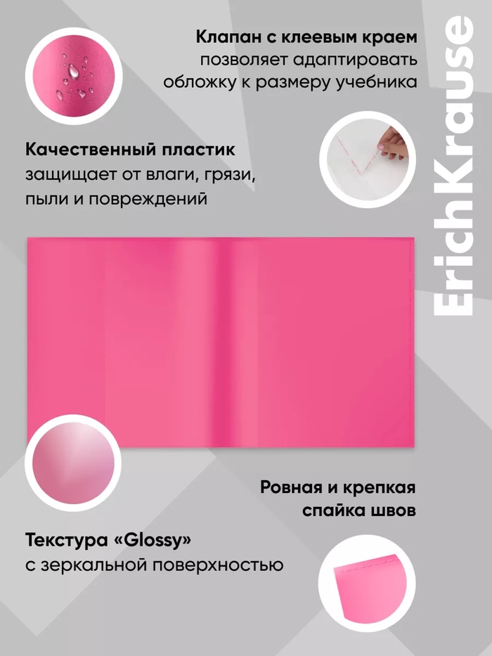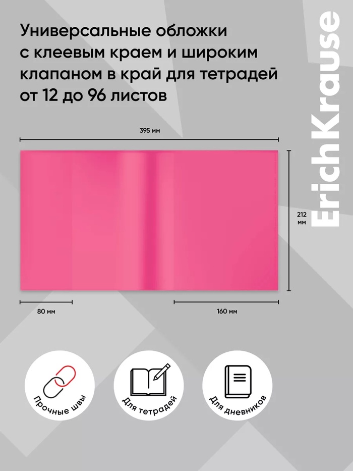 Обложка из высококачественного ароматизированного непрозрачного пластика с особо прочными швами и текстурой поверхности "зеркало". Надежно защищает тетради и дневники от повреждений. Широкий клапан в край с клеевым краем позволяет адаптировать обложку к размеру тетради/дневника. Цвет обложки - ассорти: голубой, розовый. Размер - 212х395мм, толщина - 0.1мм. Аромат - жевательная резинка. В наборе имеются стикеры для подписи. Гарантированно подходит для продукции ErichKrause. Код и штрихкод на каждой единице товара.