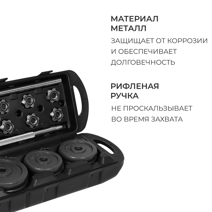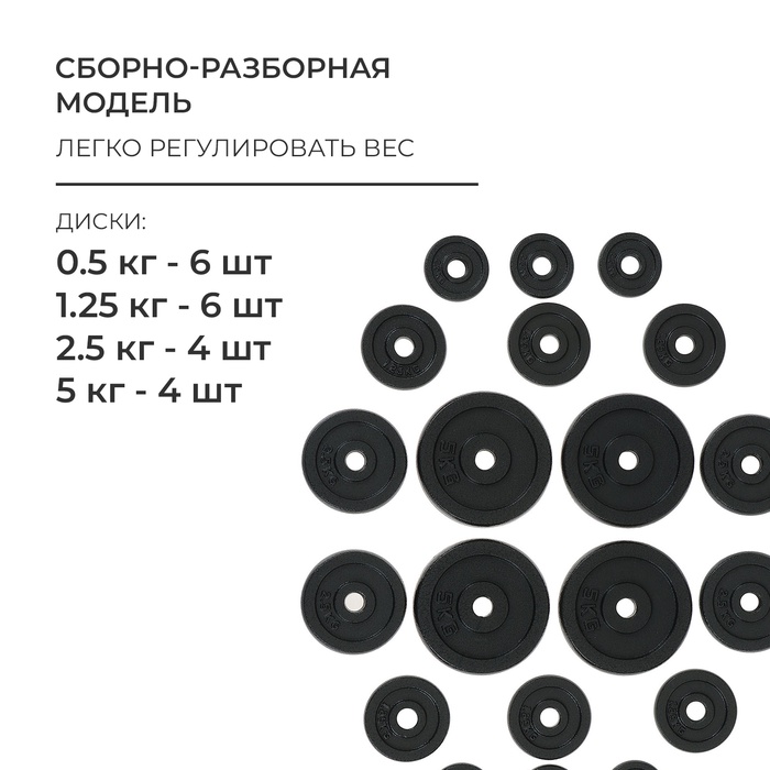 - Диски: 0,5 кг - 6 шт., 1,25 кг - 6 шт., 2,5 кг - 4 шт., 5 кг - 4 шт.