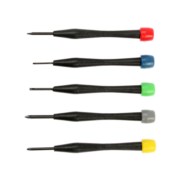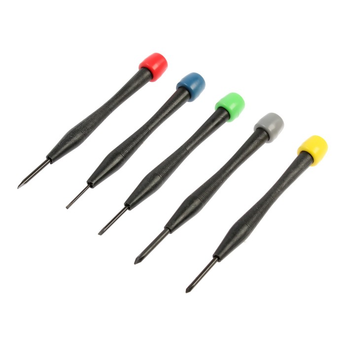 Набор состоит из крестообразных и шлицевых отвёрток со следующими размерами: Pjn H0, PH00, SL1.8, SL2.4 и SL3.