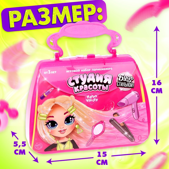 Чтобы стать настоящей звездой вечеринки, достаточно воспользоваться наборчиком. В него входит: фен, расчёска, зеркальце, духи, помада! Девочка почувствует себя маленькой принцессой, придумает и воплотит множество увлекательных сюжетов.