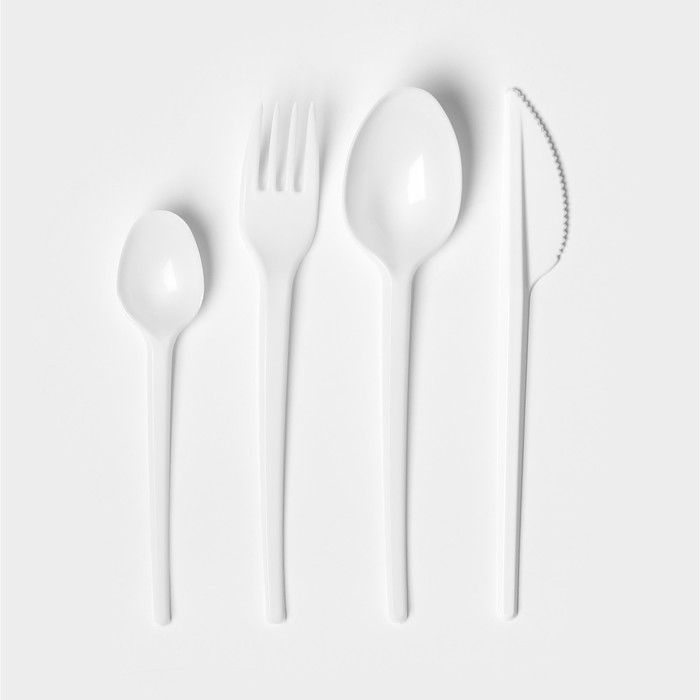 Набор пластиковых одноразовых столовых приборов, 4 предмета: вилка, ложка столовая, нож, ложка чайная, 16,5 см, цвет белый