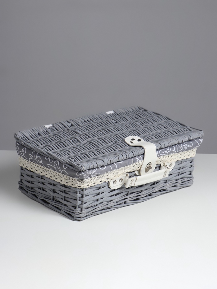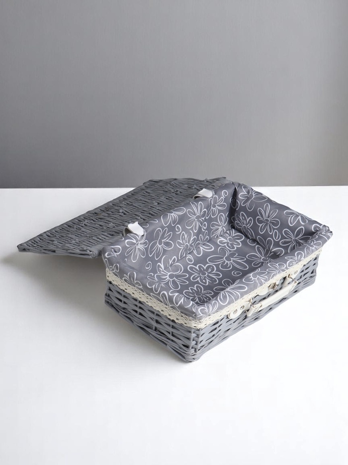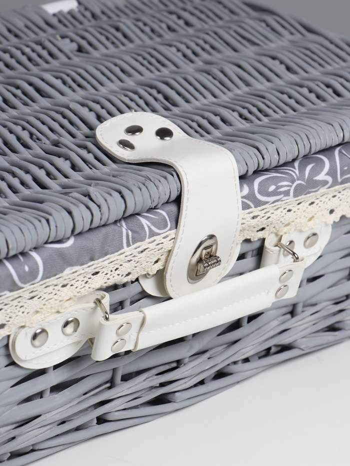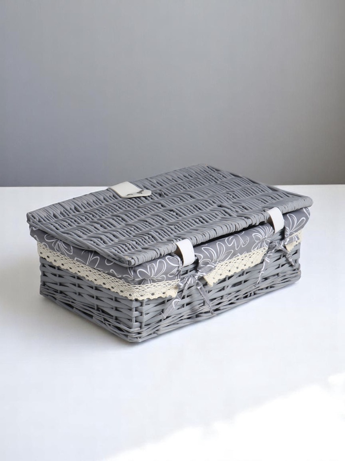 Серый цвет натуральной лозы в сочетании с экокожей ручек и застёжек придаёт изделиям особую элегантность. Тканевая подкладка внутри не только защищает содержимое, но и добавляет уюта — такие корзины приятно брать в руки и рассматривать вблизи.
