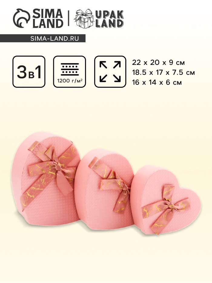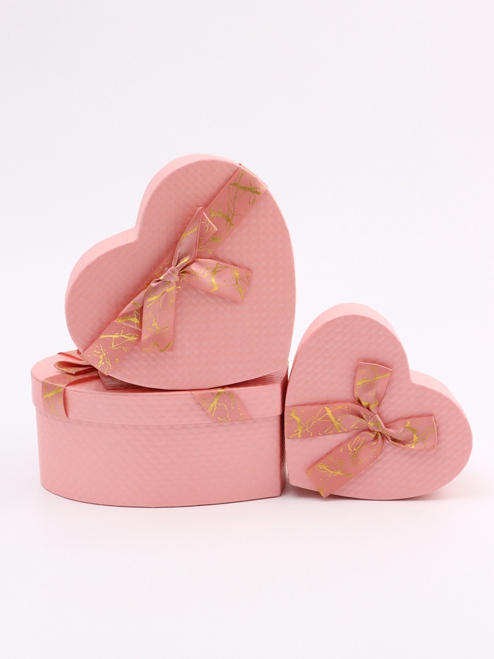 Набор подарочных коробок сердце 3 в 1, розовый с бантом, 22×20×9; 18.5×17×7.5; 16×14×6 см