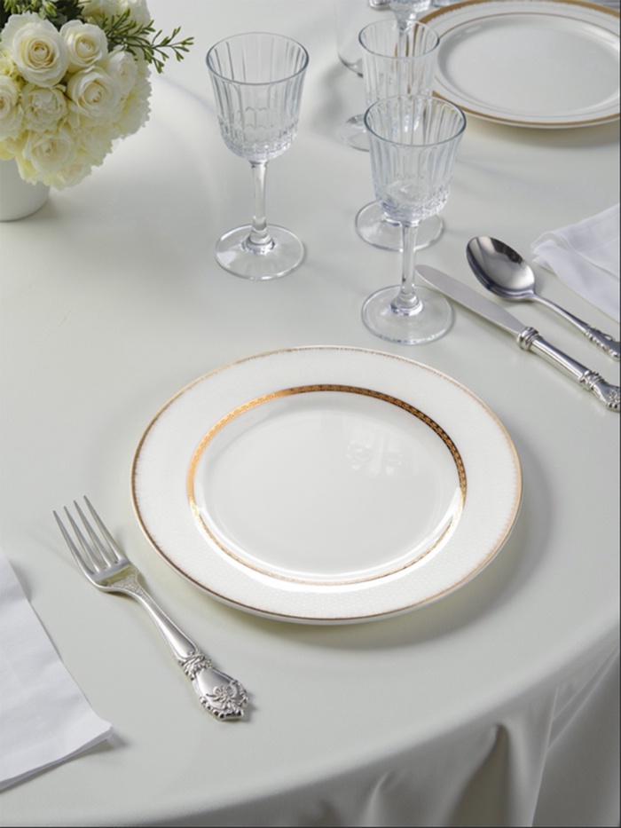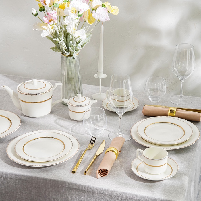 - Изысканный дизайн: белоснежный фарфор с нежным рисунком и золотой отделкой.
