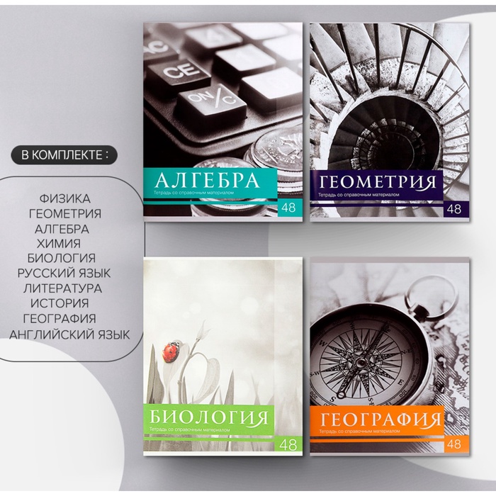 - В комплект входит 10 предметов: алгебра, английский язык, биология, география, геометрия, история, литература, русский язык, физика, химия