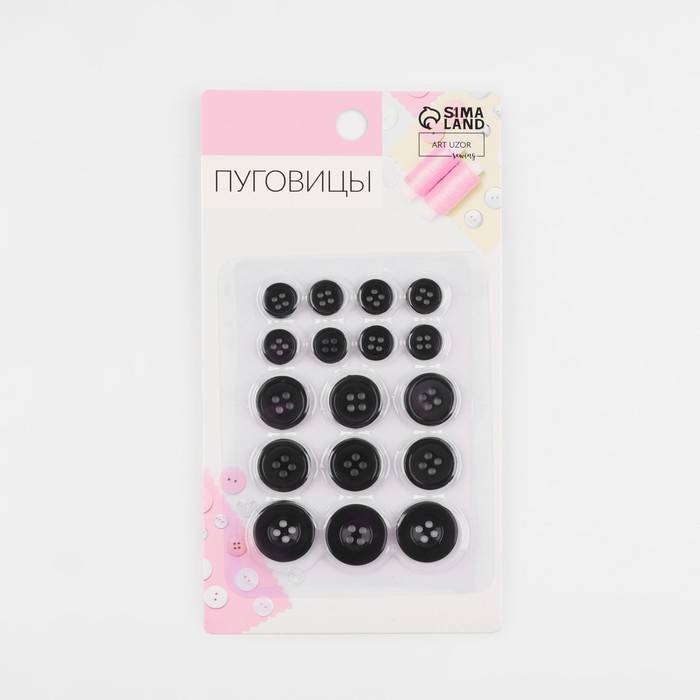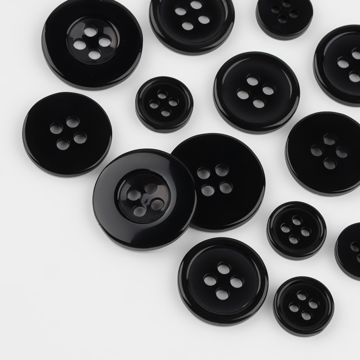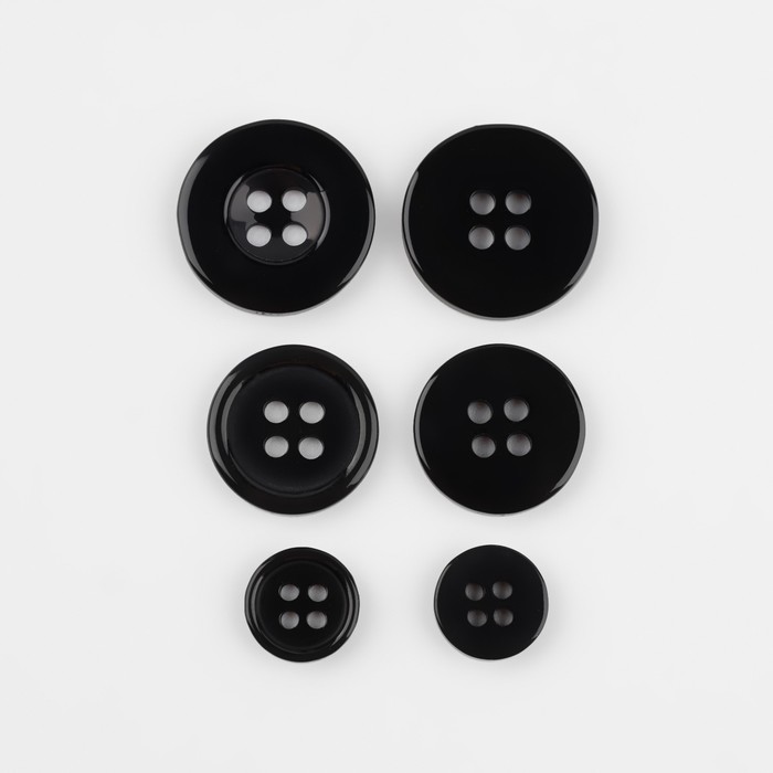 Набор чёрных пуговиц объединяет три практичных размера для одежды и рукоделия. Классические четырёхдырочные пуговицы подходят для рубашек, блузок и домашнего творчества. Чёрный цвет сочетается с большинством тканей.