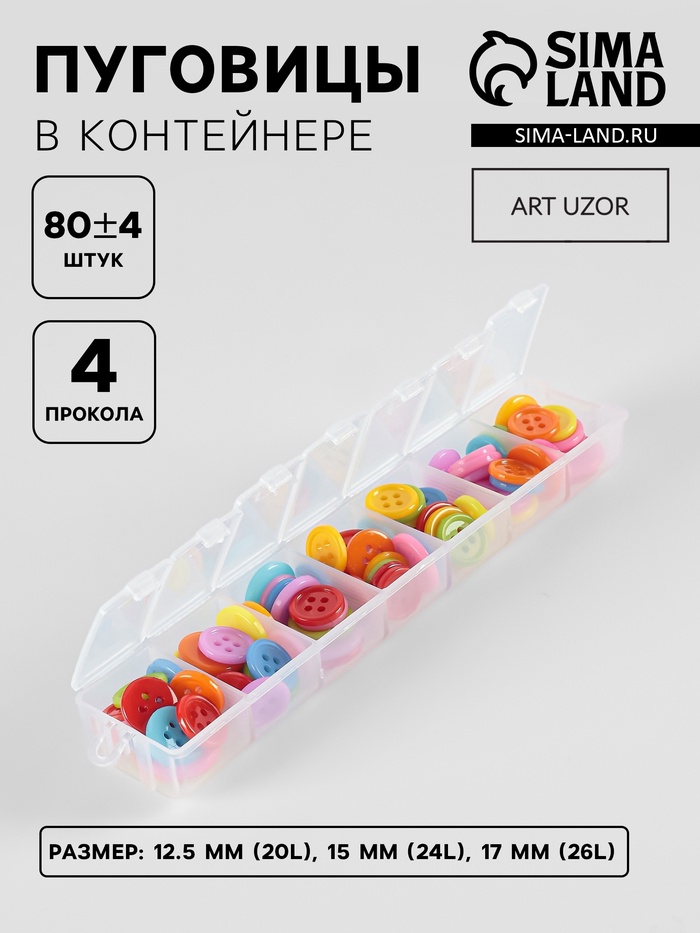 Набор пуговиц, 4 прокола, d = 12,5 / 15 / 17,5 мм, 80 ± 4 шт, в контейнере, цвет разноцветный