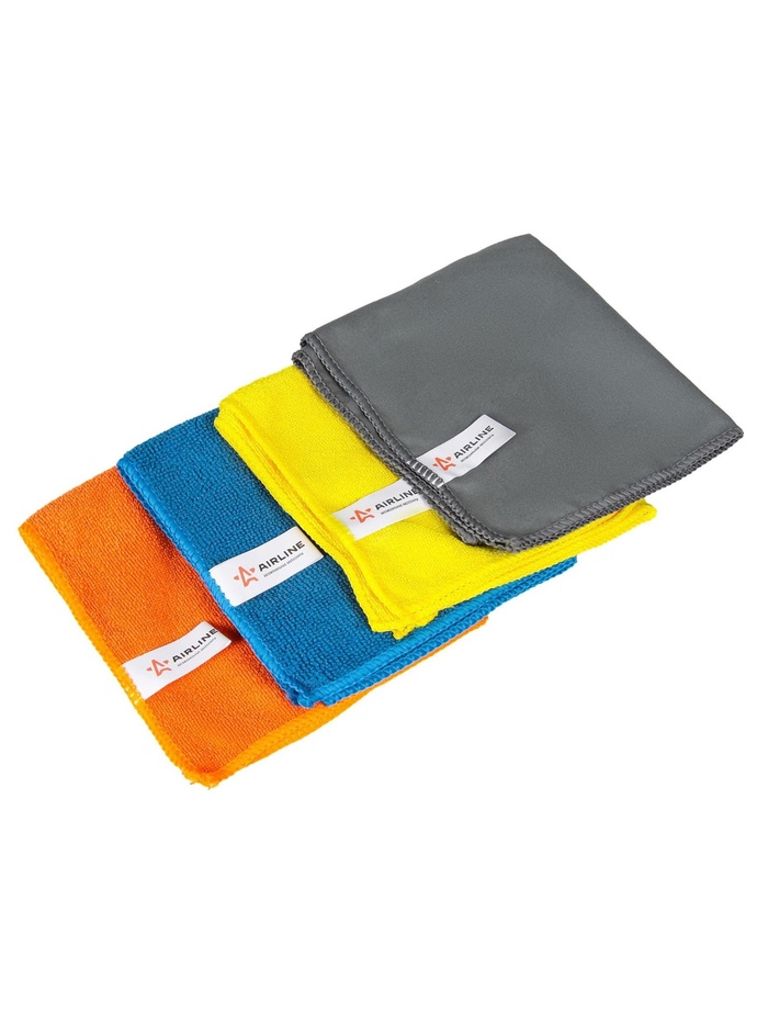 AIRLINE представляет набор из 4-х микрофибровых салфеток размером 20 х 20 см. Состав из микрофибры наделяет салфетки рядом преимуществ, среди которых - повышенная влаговпитываемость, а также особое строение верхнего слоя изделия, которое не только устраняет грязь, но и полирует протираемую поверхность.