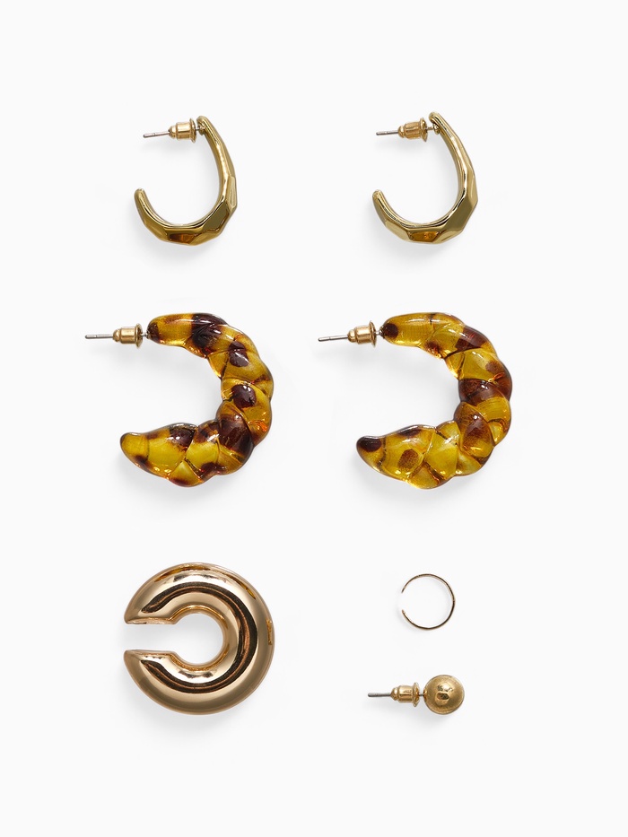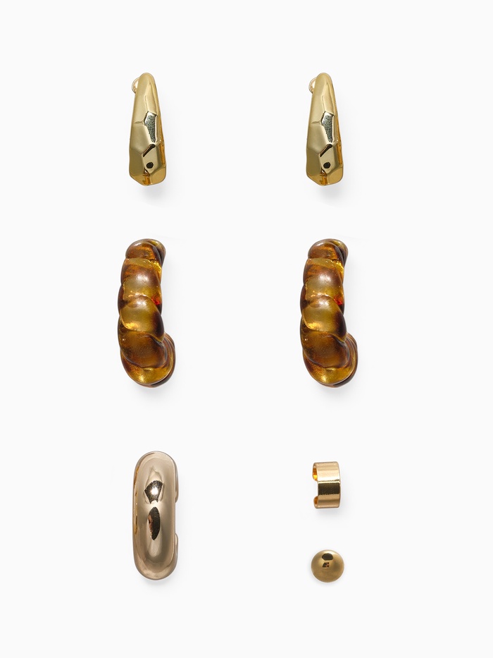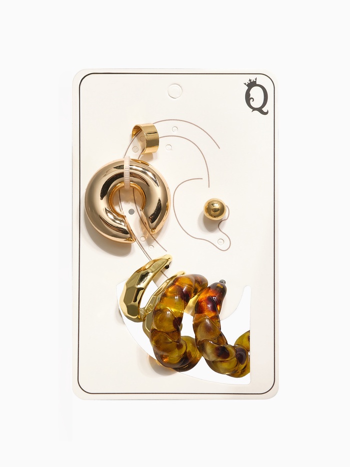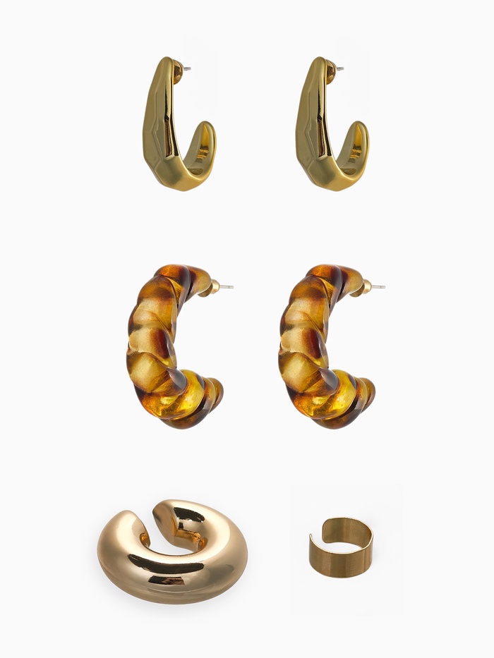 Погрузитесь в мир моды и самовыражения с набором серег и кафф, который станет вашим верным спутником в создании уникальных образов. Этот комплект из семи стильных аксессуаров в золотистом цвете дополнен коричневыми вставками, что делает его идеальным выбором для женщин, стремящихся подчеркнуть свою индивидуальность и элегантность.