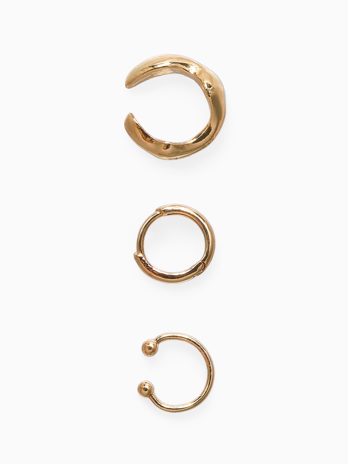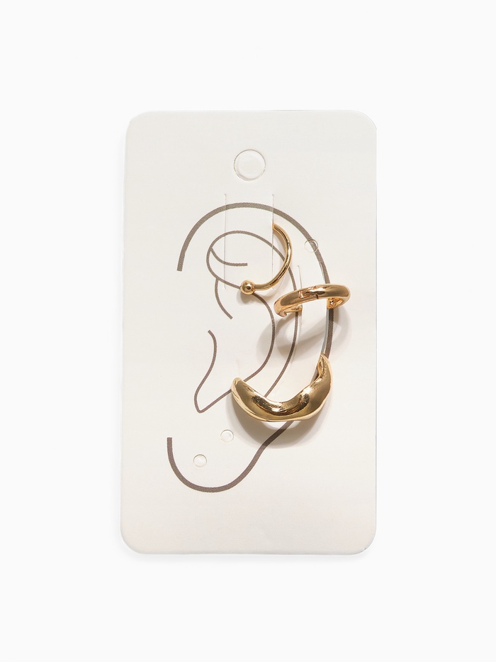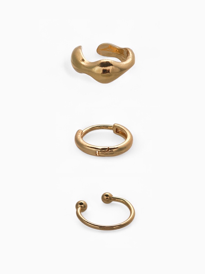 Три элегантных украшения в золотистом цвете объединены в одном наборе, который воплощает современный минимализм и трендовые формы. Компактные кольца с застёжкой-конго и кафф без прокола длиной 1,1 см создают гармоничный ансамбль, способный подчеркнуть утончённый вкус и добавить изящества в любой образ.
