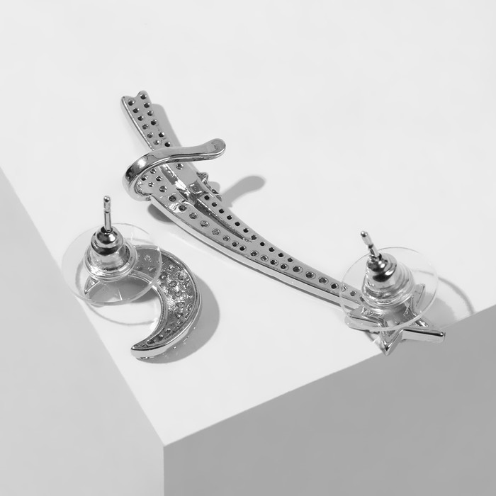 Набор серьги и кафф падающая звезда и месяц, цвет белый в серебре