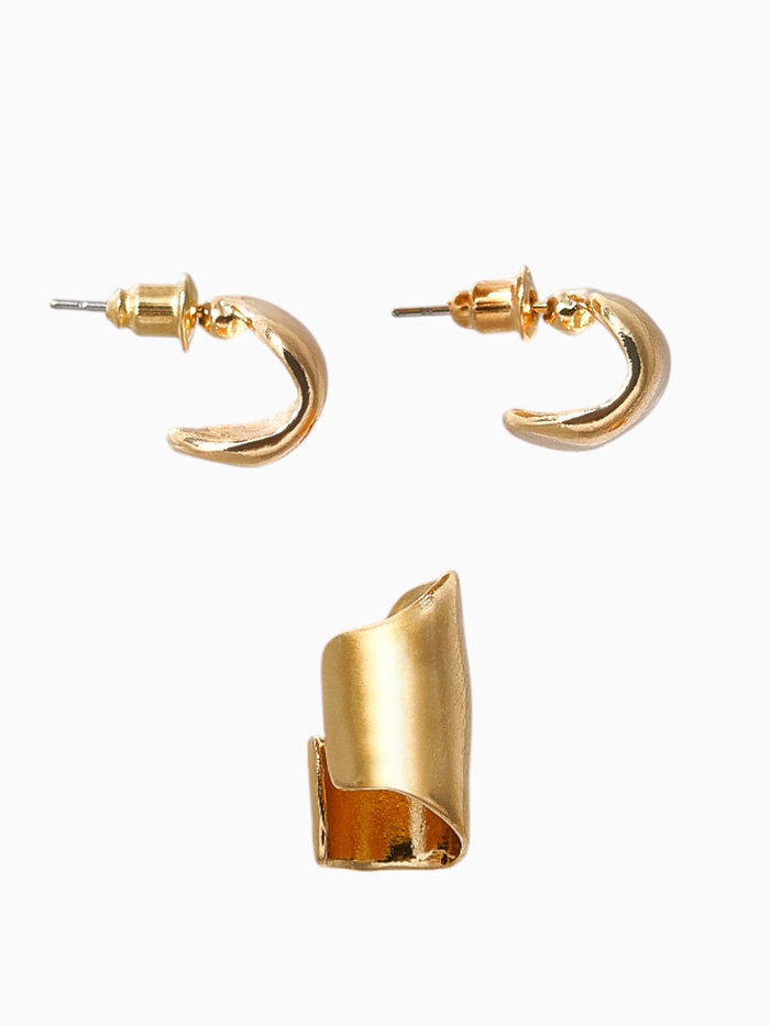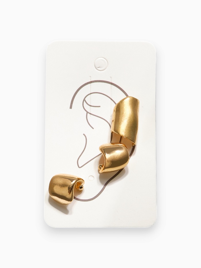 Набор из трёх украшений в золотом цвете воплощает актуальный тренд минимализма, предлагая идеальное сочетание изящества и универсальности. В комплект входят две пары серёжек — классические пусеты и кафф без прокола, что позволяет создавать разнообразные стильные образы без лишних усилий.