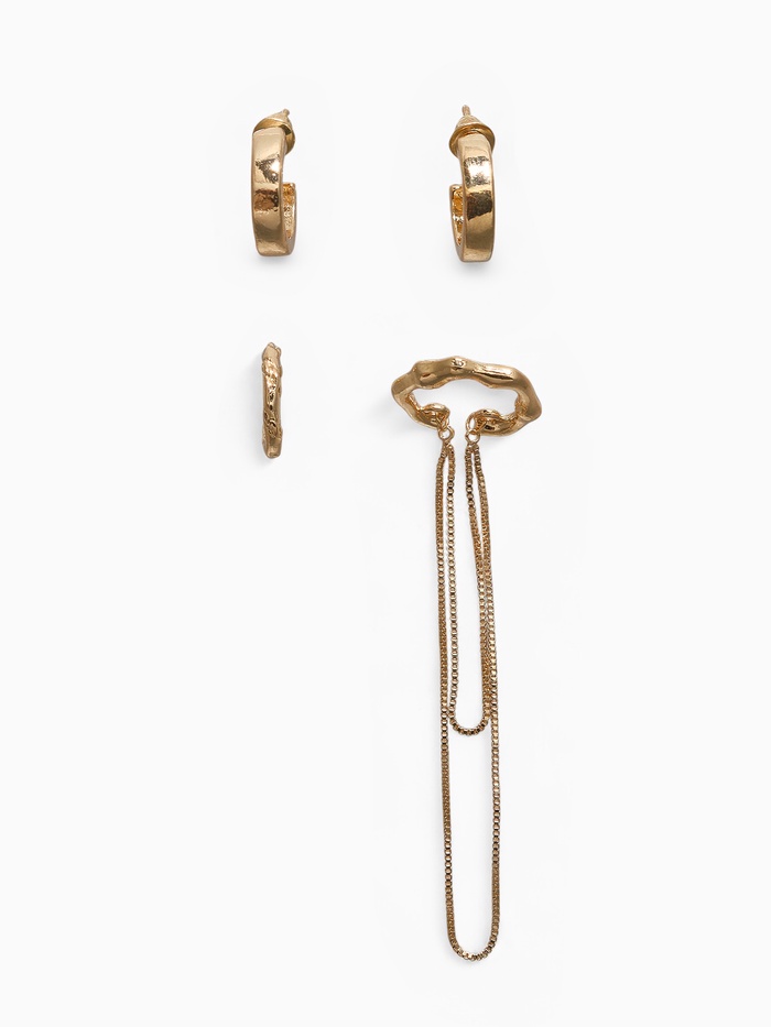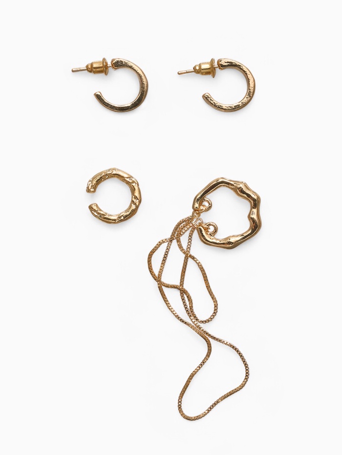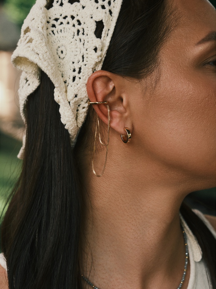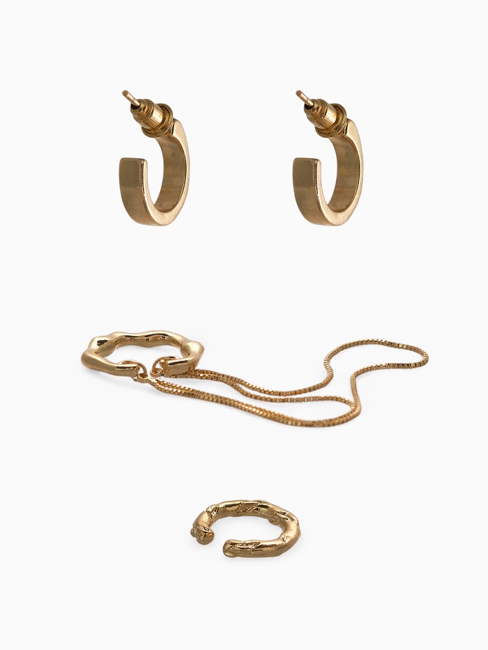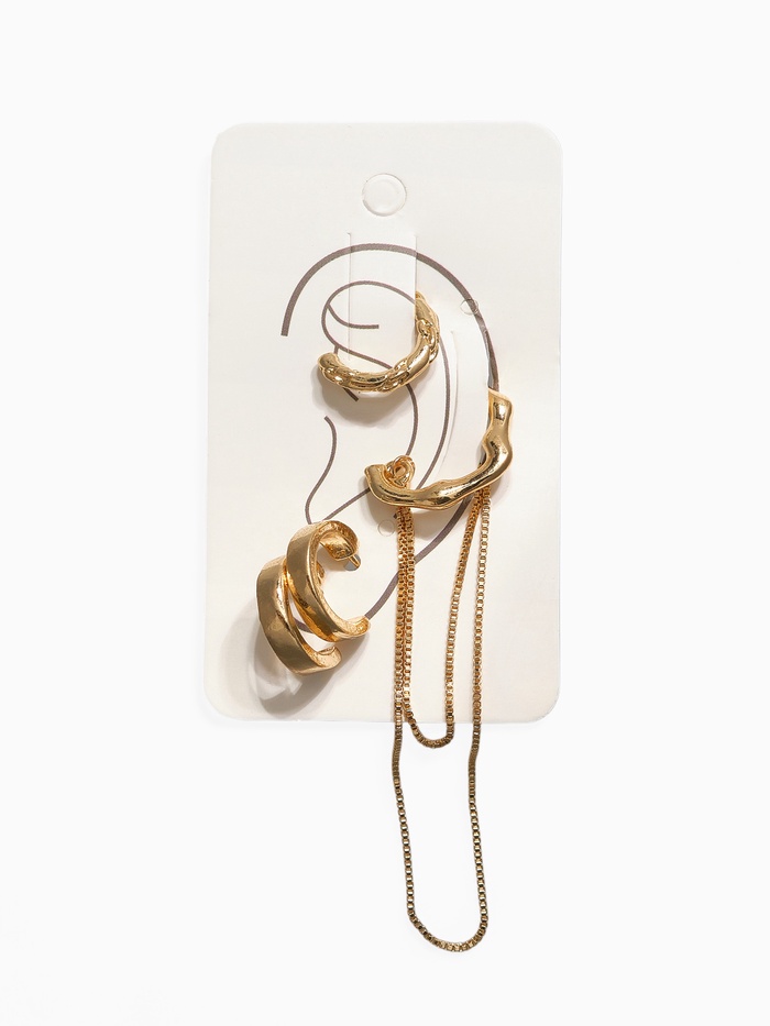 Набор из четырёх украшений в золотистом цвете воплощает элегантность минимализма с эффектом «водопад», который придаёт образу лёгкость и динамичность. В комплект входят каффы без прокола и классические серьги-пусеты, объединённые изящной цепочкой — этот дизайн позволяет создавать необычные и стильные сочетания, подчёркивая индивидуальность каждой женщины.
