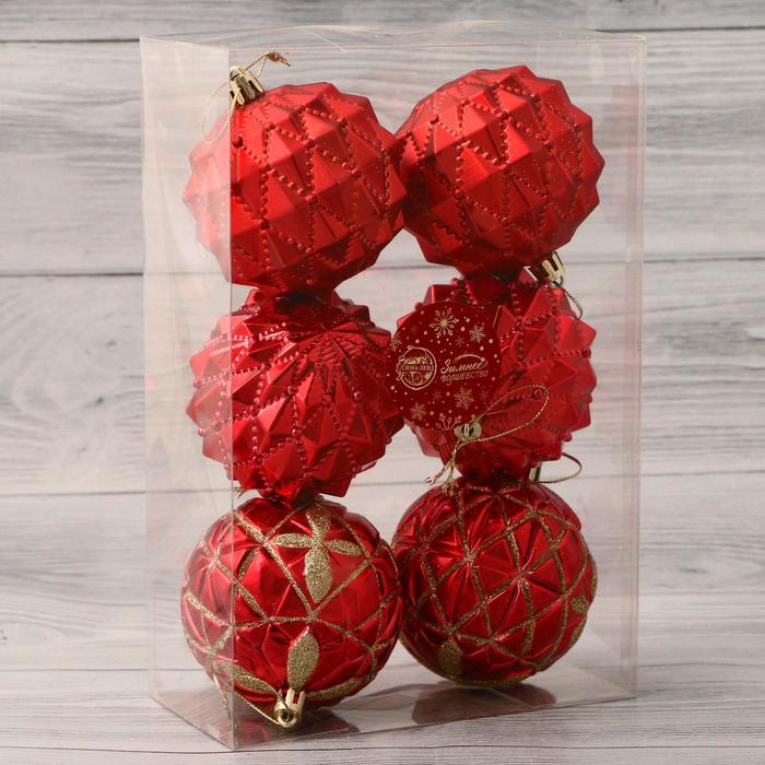 Набор шаров пластик d-8 см, 6 шт "Беата сеточка блеск" золотисто-красный
