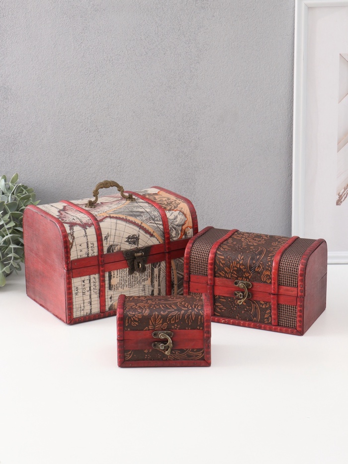 Три разных размера (22×15×15 см, 18×11.4×11.4 см и 12×7.7×7.7 см) позволяют удобно организовать хранение украшений любого типа - от массивных аксессуаров до изящных колец. Каждый сундучок украшен тематическими рисунками - картами мира и цветочными мотивами, что придаёт им особый характер.