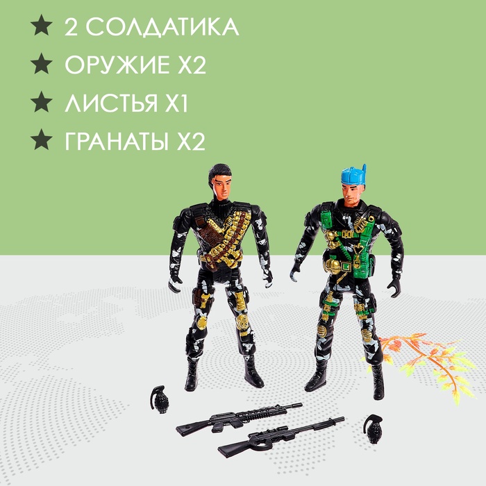- В комплекте 7 предметов: две фигурки солдат, две винтовки, две гранаты и дерево.