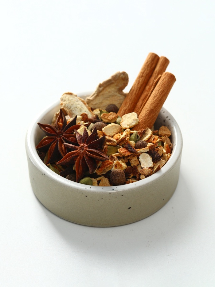 Состав: целые дольки сушеных апельсина и яблока, цедра апельсина и мандарина, палочка корицы, гвоздика, кардамон, бадьян.