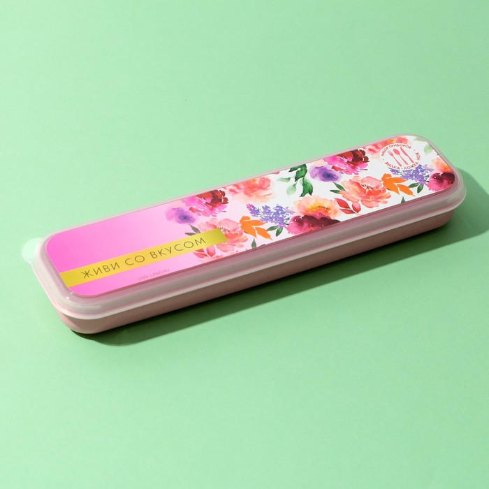 Набор столовых приборов из пластика в удобном контейнере состоит из вилки, ложки и ножа.