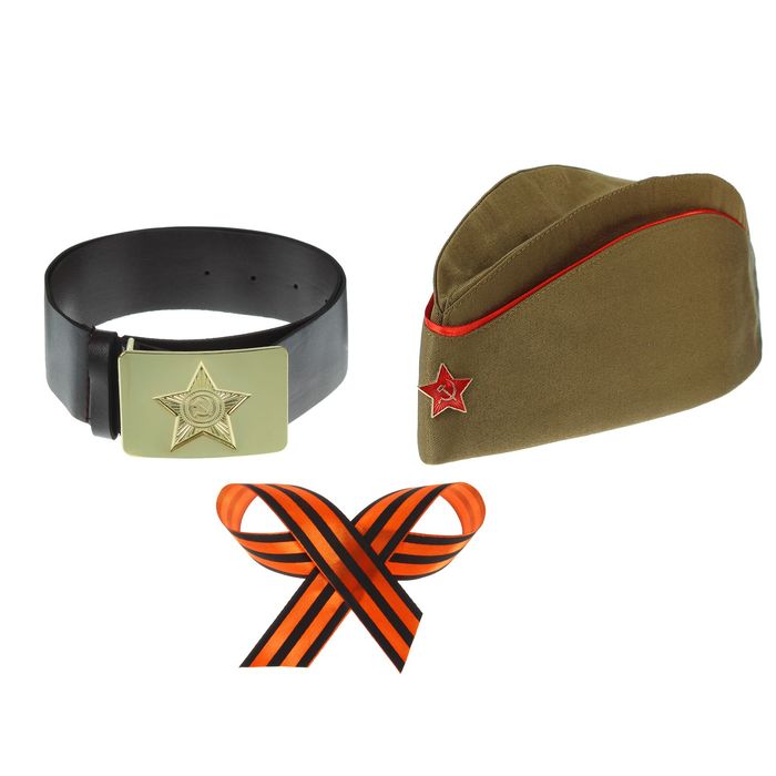 Набор военного, 3 предмета: пилотка, георгиевская лента, ремень — выбор настоящего патриота. Он дополнит ваш костюм и превратит любого мужчину в статного офицера с идеальной выправкой. Такие аксессуары подойдут для любого военного праздника, театрализованных постановок, участия в патриотических представлениях, торжественных шествиях.