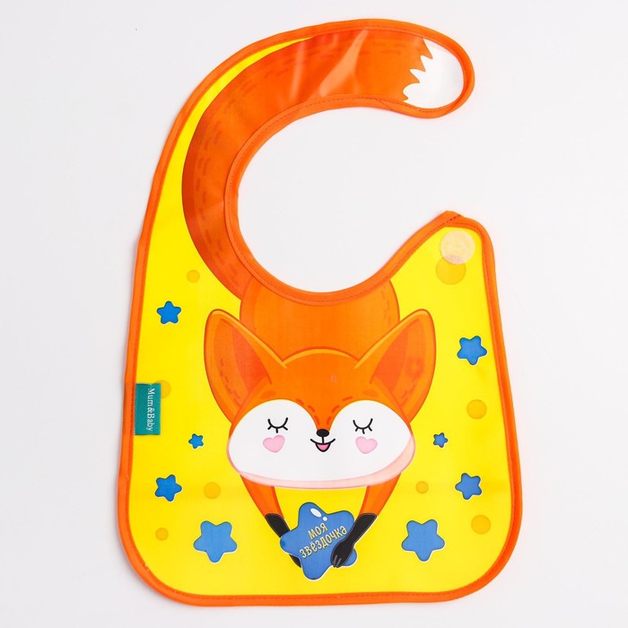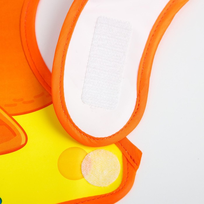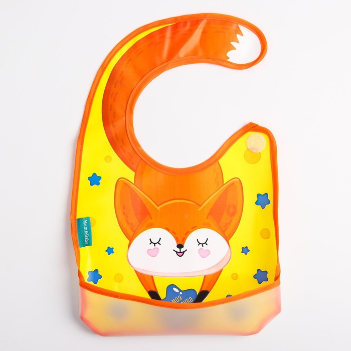 Нагрудник не промокает и качественно защищает, поэтому одежда малыша не испачкается в процессе кормления. У слюнявчика есть специальный кормашек, который выворачивается на лицевую сторону на время приема пищи, в него попадают все крошки: чистым останется не только сам ребёнок, но и место, где он кушает.