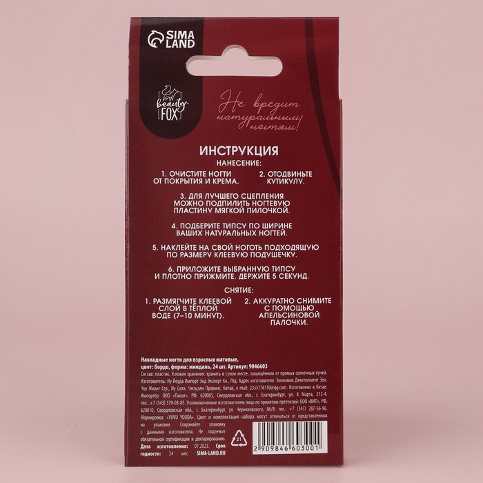 Накладные ногти держатся до двух недель в зависимости от способа крепления и интенсивности воздействия на ногти в процессе носки. Можно использовать клей для накладных ногтей (приобретается отдельно) – это увеличит срок носки. При бережном ношении ногти можно использовать несколько раз.