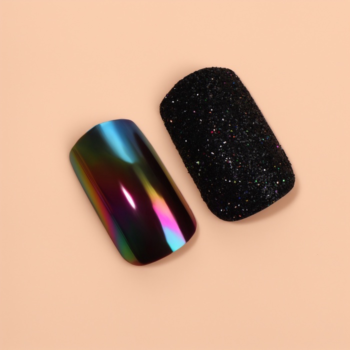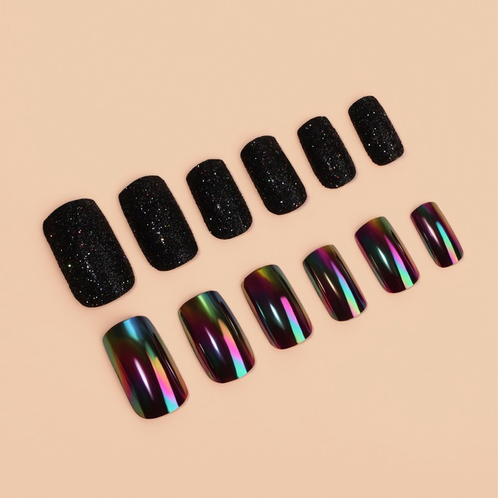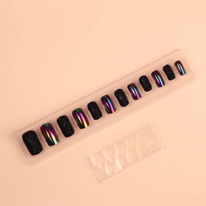 Накладные ногти «Ночь», 12 шт, с блёстками и голографией, с клеевыми пластинами, форма мягкий квадрат, чёрные