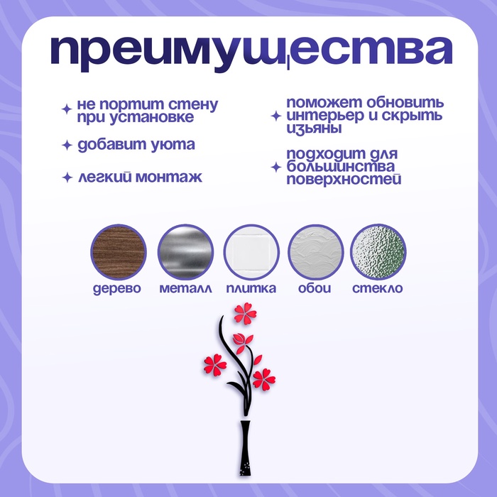 Изделие легко крепится на любой чистой, сухой, гладкой поверхности. Например, на окрашенной или оклеенной обоями стене, стекле, керамической плитке, металле, пластике. Наклейки легко снимаются и не оставляют следов, поэтому их удобно часто менять или использовать в съёмной квартире.