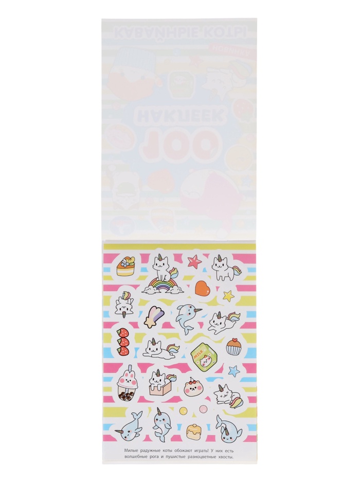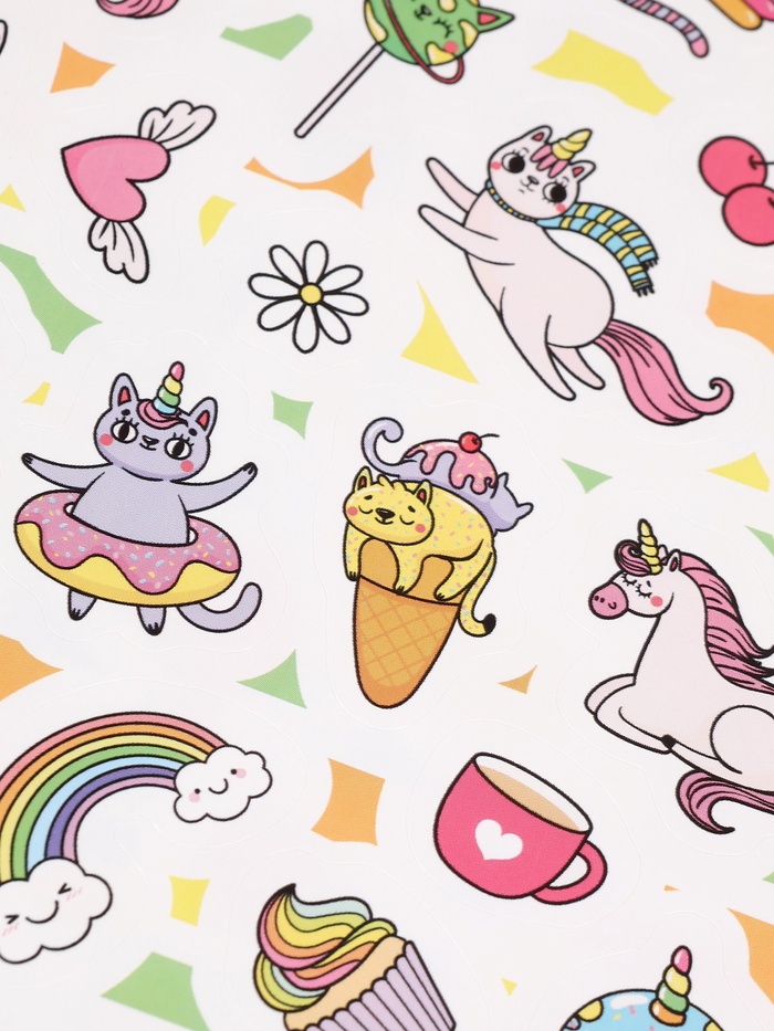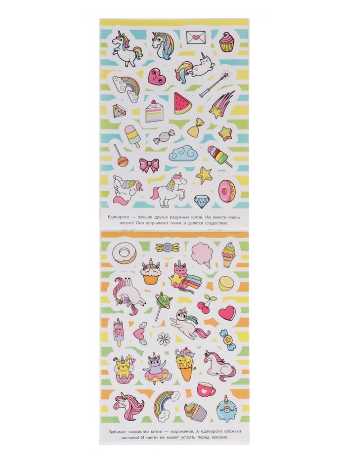 - 100 наклеек с изображениями очаровательных котов, единорогов и сладостей, которые вдохновляют на творчество.