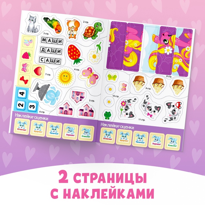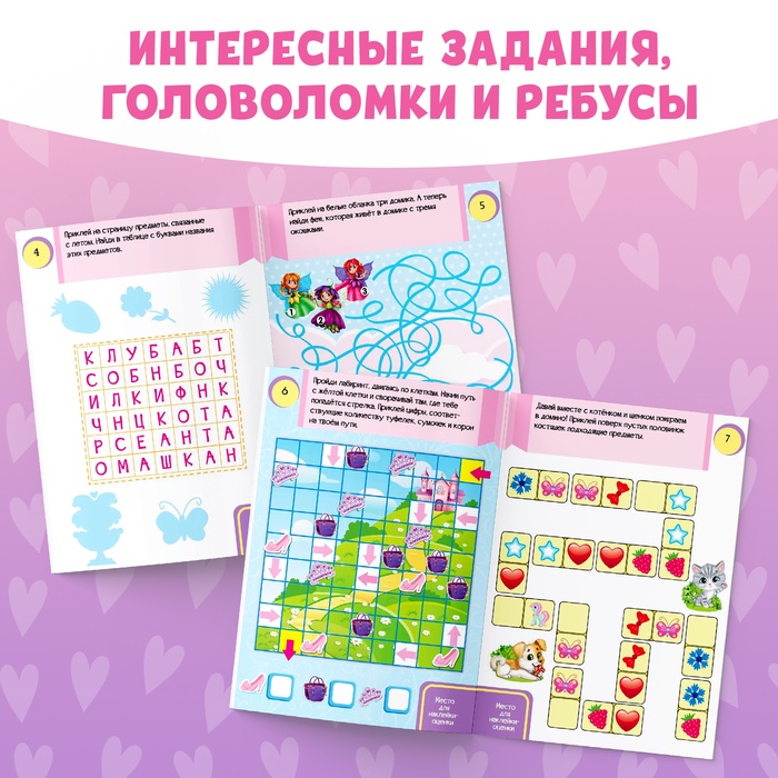 - Яркие наклейки и задания, способствующие развитию логического мышления и внимания.