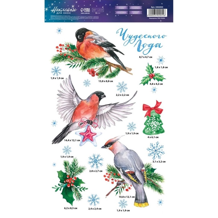 Наклейки на окна многоразовые «С Новым годом», снегири, 20×34 см