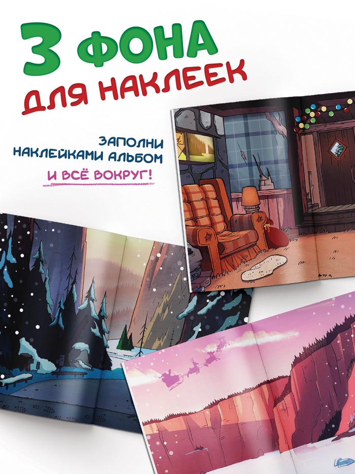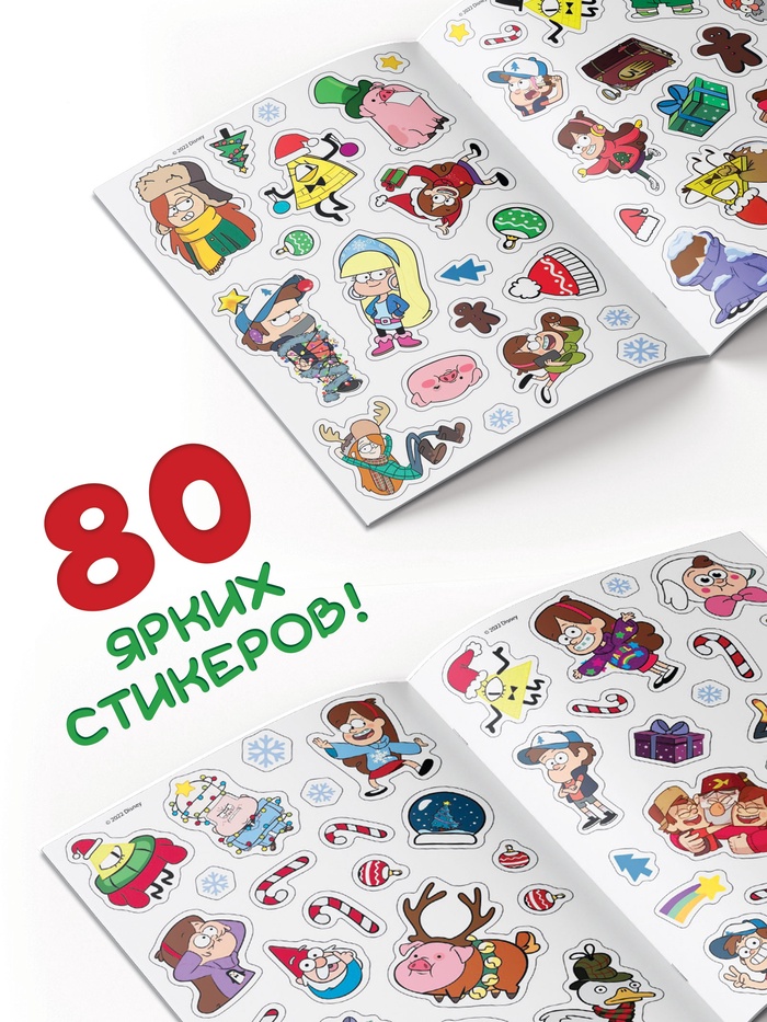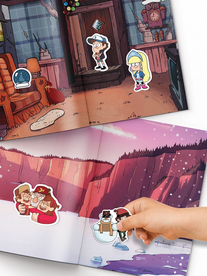 - В альбоме представлено 80 тематических наклеек с красочными изображениями Мейбл и Диппера и их близких полюбившегося мультфильма.