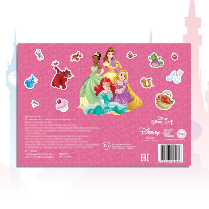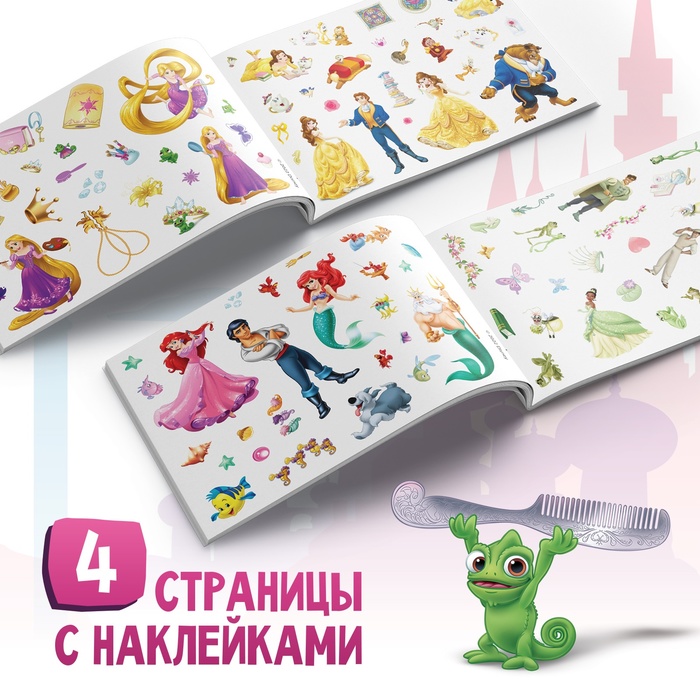 - В альбоме представлено 100 тематических наклеек с красочными изображениями героев из мультфильмов «Рапунцель», «Красавица и чудовище», «Русалочка» и «Принцесса и лягушка».