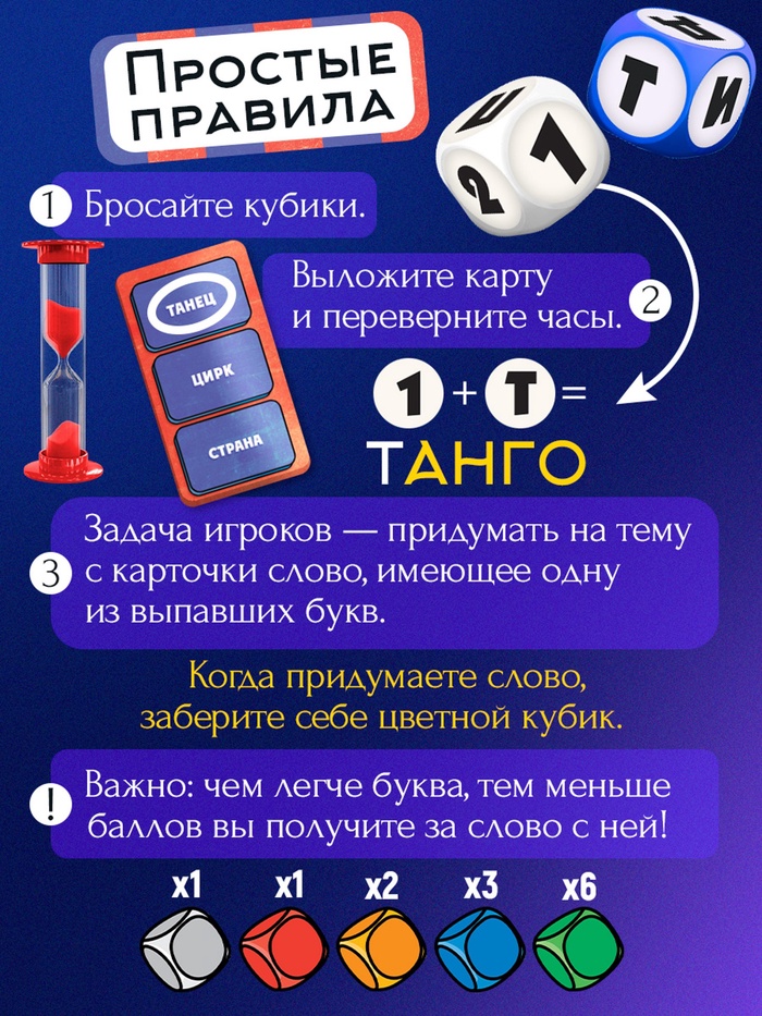 - За каждую букву на кубиках в слове игрок, придумавший слово, получает баллы.