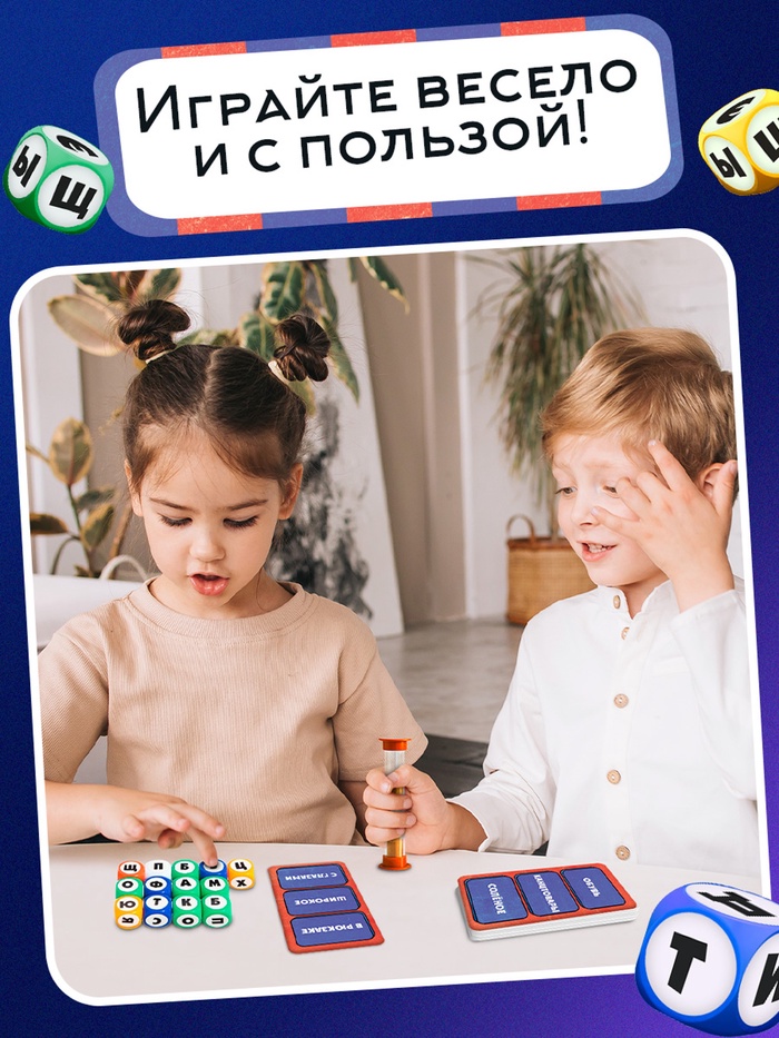 - Песочные часы и все кубики положите между игроками. В игре есть 2 типа кубиков: цветные показывают, какие буквы нужно использовать, белый отвечает за место буквы в слове.