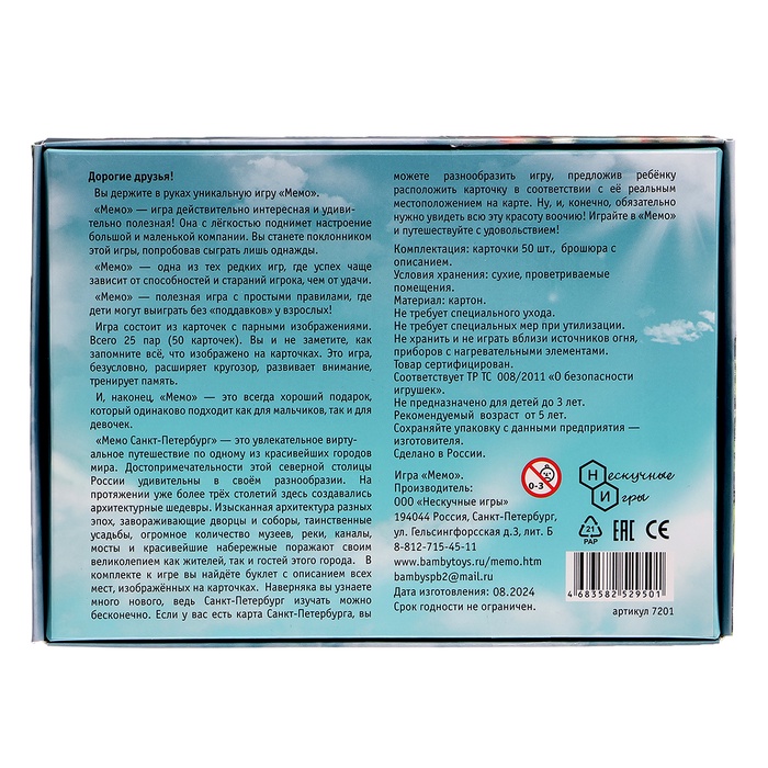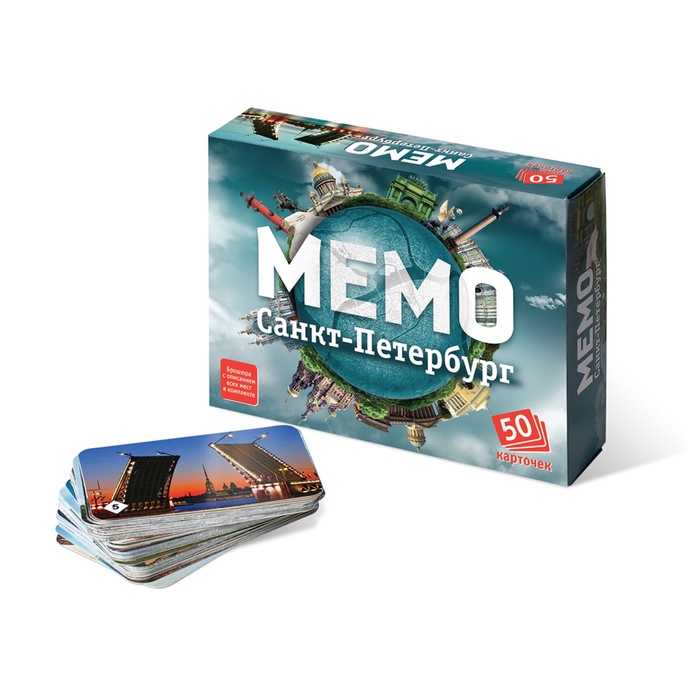 «Санкт-Петербург» — это разновидность игр мемо. Их особенность в том, что успех зависит не от удачи, а от способностей и стараний игроков. Набор состоит из 50-ти карточек с парным изображением памятников и достопримечательностей.