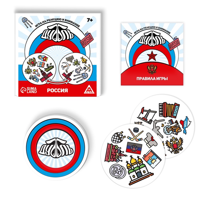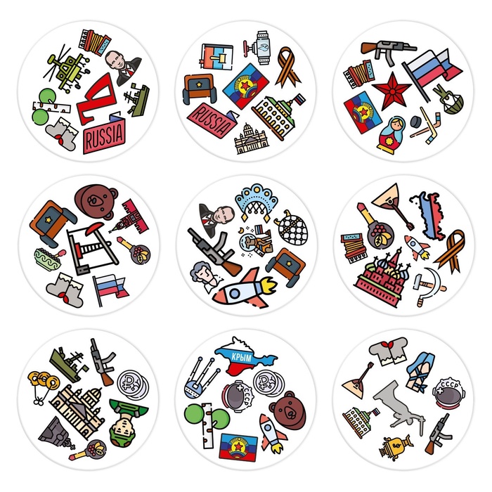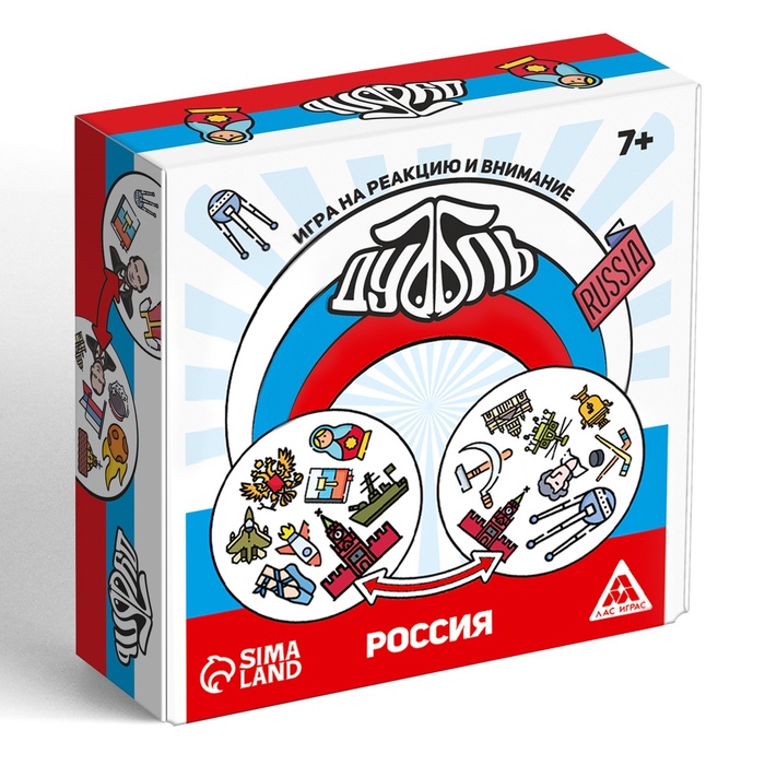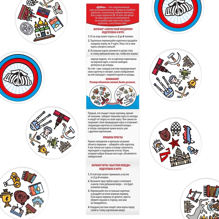 В этой игре есть всё, что близко русским людям, — берёзки, традиции, великие люди, достопримечательности и не только. Внутри вас ждёт 55 карт с уникальным набором картинок. На каждой паре карт есть только одно общее изображение. Его-то вам и нужно найти!
