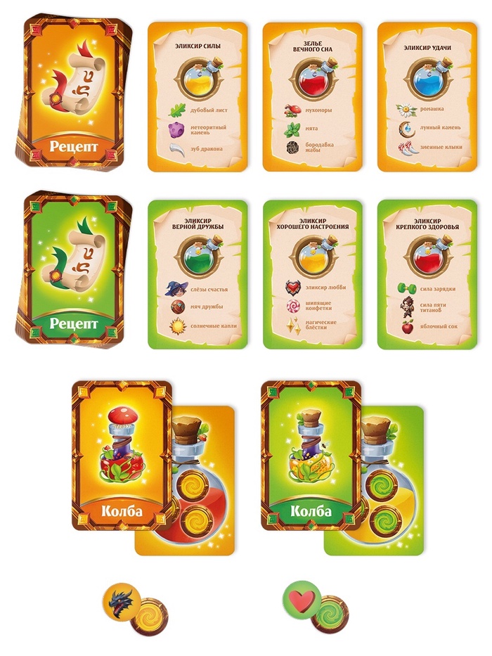 - Задача игроков - собрать ингредиенты, указанные на карточках «Рецепт», которые участники вытягивают