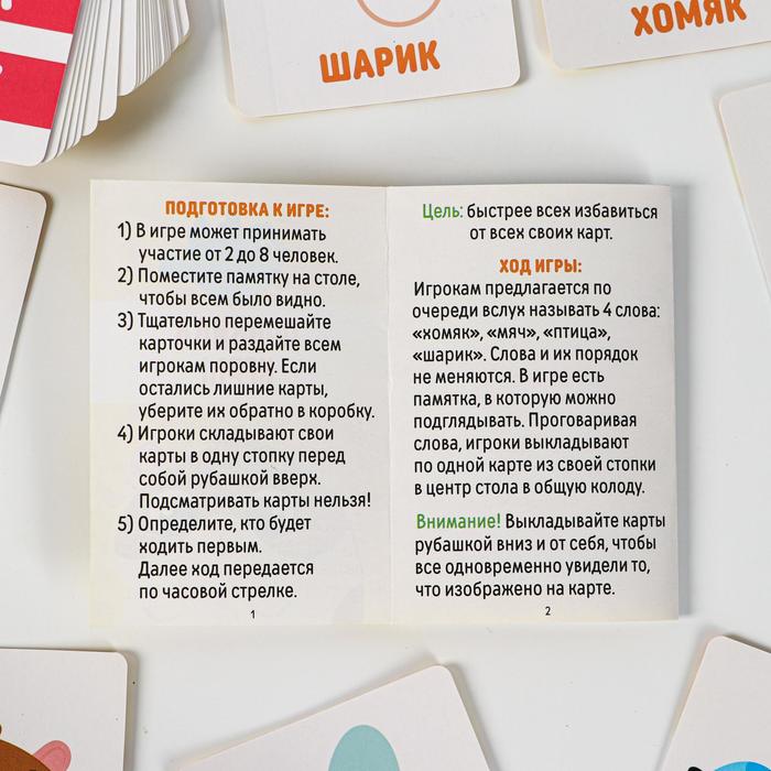 Перед вами увлекательная игра, которая поможет натренировать внимание и реакцию, а ещё весело и интересно провести время. Что нужно делать? Быть очень внимательным и следить за тем, что говорят и выкладывают остальные игроки. А самое главное — быстрее всех хлопнуть по карточкам в нужный момент. Ведь только так можно победить.