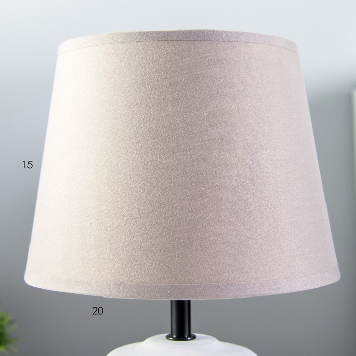 - Трапециевидный текстильный абажур в бежевых тонах мягко рассеивает свет, создавая комфортную атмосферу.