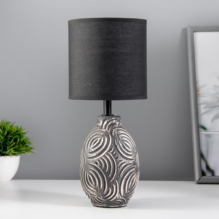 - Текстильный абажур тёмных тонов равномерно рассеивает свет, создавая приятную атмосферу.