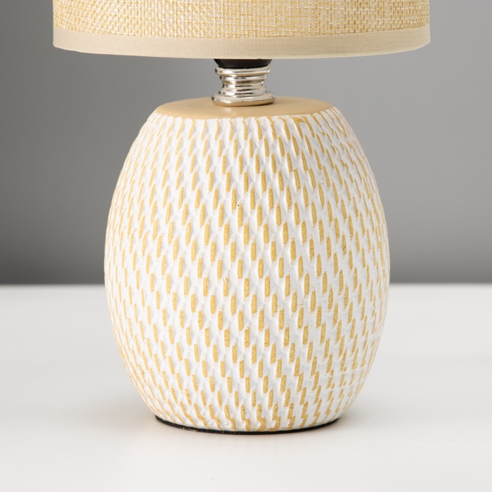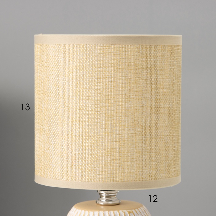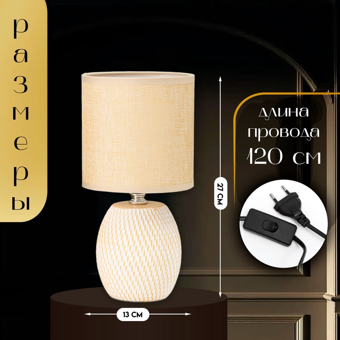 Эта настольная лампа с изысканным абажуром станет стильным дополнением вашего интерьера. Сочетание бежевого и белого цветов придаёт ей универсальность, позволяя легко вписаться в любое пространство. Компактные размеры делают её идеальным выбором для столов, тумб и полок.