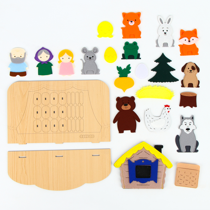 Настольный театр — это развивающая игрушка для театрализованных игр с детьми, который сочетает в себе кукольный, настольный и пальчиковый театры. Развивающая игра «Настольный театр 3 в 1» подарит ребёнку сказочный мир и познакомит с замечательными персонажами русских народных сказок «Репка», «Колобок», «Курочка Ряба».