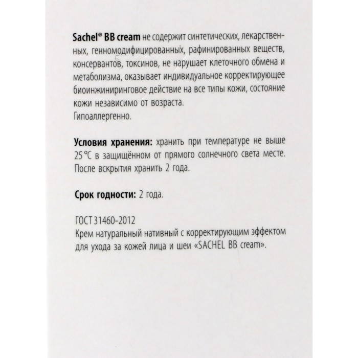 «Сашель» BB cream не содержит пигментов, предназначен для использования в дневное время в качестве альтернативы тональным кремам с пигментами, обладает лёгкой текстурой, сохраняет дыхание кожи даже в жаркую погоду, идеален для чувствительной, проблемной, жирной кожи, способствует регуляции водного баланса, не обладает парниковым эффектом, содержит натуральный УФ защитный фактор SPF 60.